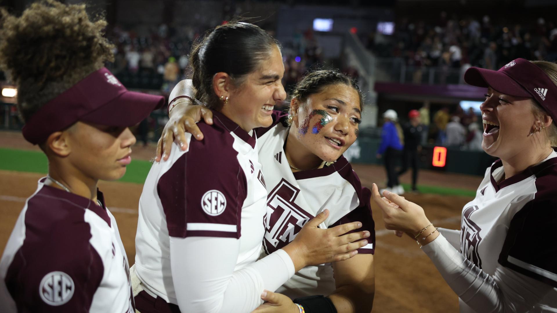 Powell shouts out the Aggies' faithful before being bombarded by her teammates after they pick up the series win in their doubleheader vs. Georgia.