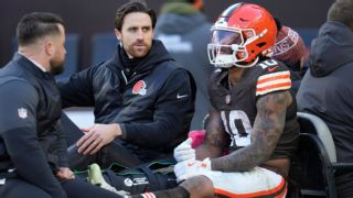 Browns standout rookie RB Quinshon Judkins (leg) carted off