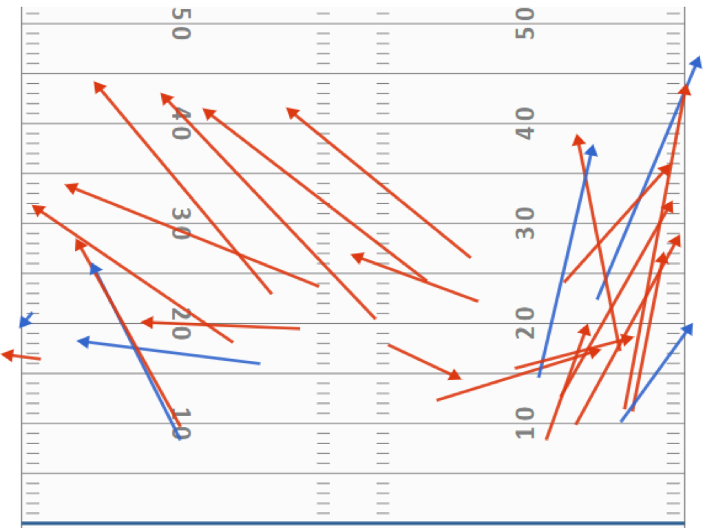 Below is a plot of each of Lockett's 15-plus air-yard targets, with the arrows indicating where he ran between the time the ball was released and its arrival. What's noticeable right away, besides how many catches (red) there are for deep passes, is that Lockett has two clear clusters of routes: down the right sideline and across the field from right to left.
