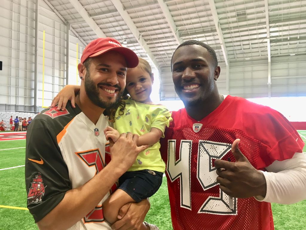 Last player off the field? Bucs rookie Devin White, who signed every autograph and posed for every photograph, including this one with fans Kedwin and Leah Garcia.