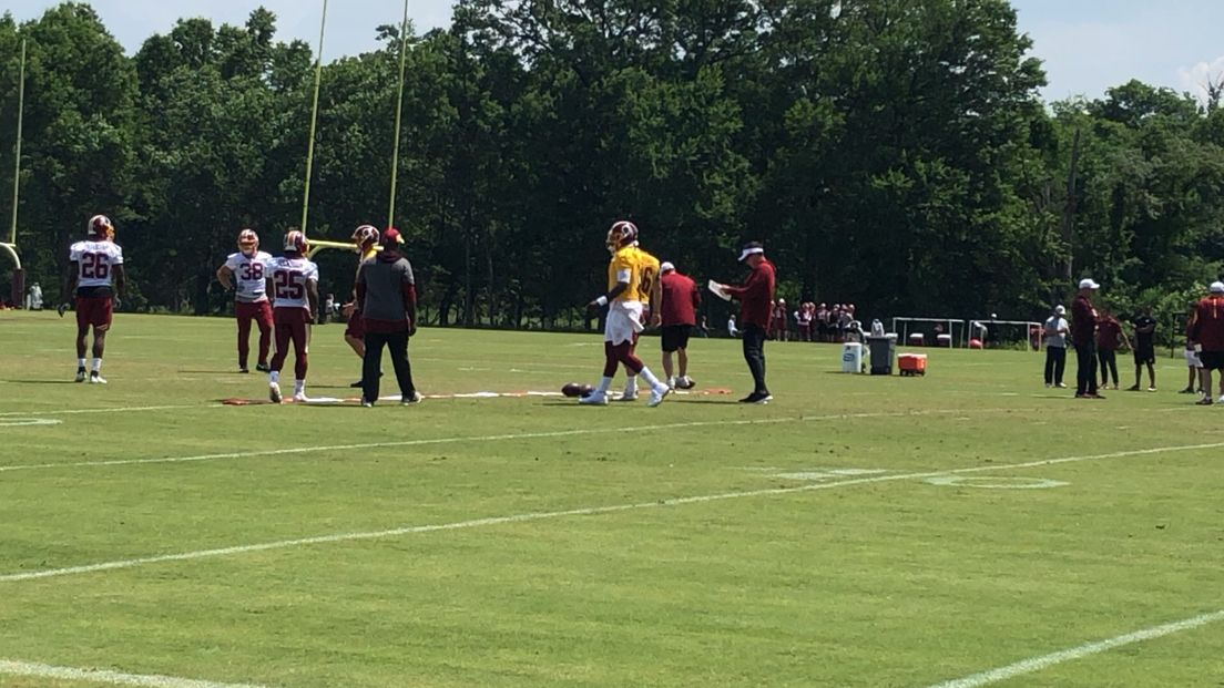 Dwayne Haskins showed off his arm – again – but he had an inconsistent day throwing the ball. Perhaps his big mistake was running the ball late in a two-minute situation when the offense had no more timeouts; the clock would have expired. Case Keenum had the best ball of the day: an approximate 60-yard strike to receiver Cam Sims, hitting him in stride in the two-minute drill. Keenum looked more in sync.