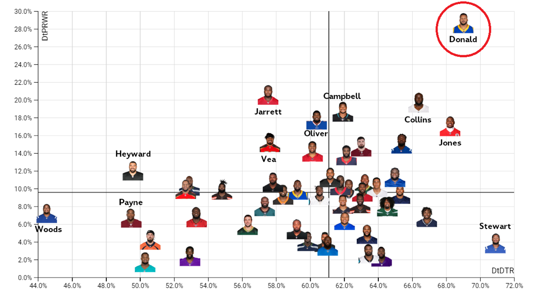 He doesn't have the sacks (5.5) we might normally associate with a top pass-rusher, but Donald has been just as dominant as ever. He ranks first by a mile in ESPN's pass rush win rate among qualifying defensive tackles -- the next highest behind his 29% is Atlanta's Grady Jarrett at 21% -- despite the fact that Donald is also double-teamed at the second-highest rate.