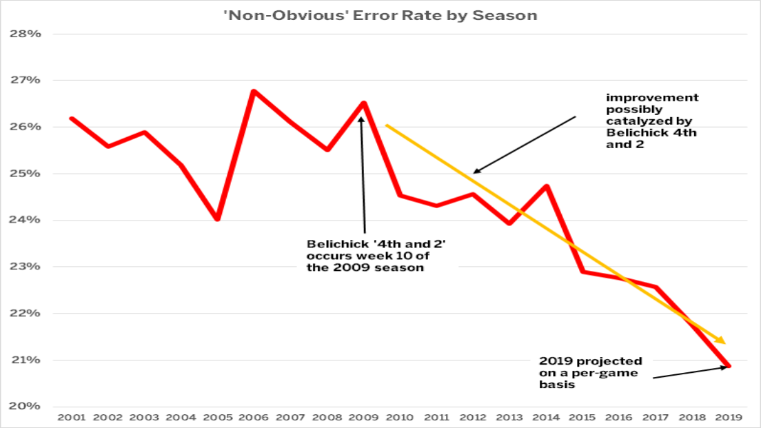 'Non-Obvious' Error rates on 4th downs by Season. It's possible that Belichick's 4th and 2 decision 10 years ago sparked an improvement.