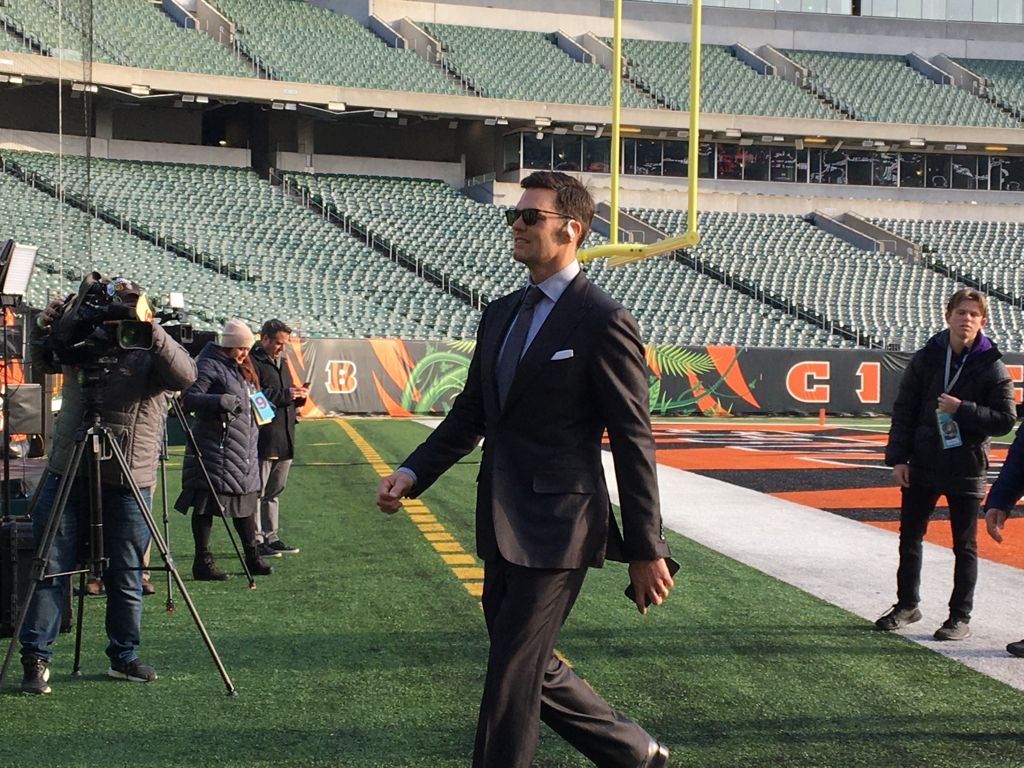 Tom Brady walks back to the locker room after a pre-game check at Paul Brown Stadium, where he hasn't played a regular-season game since 2013.