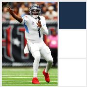 After two teams debuted their Rivalry uniforms in Week 4, it's the Buffalo Bills' turn in Week 5. The Bills will rock their all-white "Cold Front" threads against the New England Patriots on "Sunday Night Football." There are no traces of red on the design that showcases the cold winters of Buffalo. A chrome, iridescent charging buffalo appears on the sleeves. There's also a buffalo as a helmet decal and on the front of the lid. The numbers are white and with royal blue outlining, creating a frosty look. In arguably the best uniform matchup all year, the Tampa Bay Buccaneers and Seattle Seahawks will wear their respective throwback threads. For Seattle, it dons its 1990s era throwback jerseys which returned in 2023. The old royal and apple green look includes a silver helmet and the iconic Seahawks logo throughout the design. Tampa Bay will wear its white '76 jersey, which debuted in Week 3. The threads are an all-white design with orange numbers outlined in red and "Bucco Bruce" on the helmet. The Jacksonville Jaguars are also wearing their prowler throwbacks against the Kansas City Chiefs on "Monday Night Football." Alternates are well-represented this week as well. The Dallas Cowboys will don their all-white arctic look, while the Arizona Cardinals and New York Jets are wearing all black. For the first time in franchise history, the Los Angeles Chargers are going all-powder blue for their matchup against the Washington Commanders. Here's a look at the Week 5 uniforms for all NFL teams, excluding the Atlanta Falcons, Chicago Bears, Green Bay Packers and Pittsburgh Steelers, who are on a bye.  Arizona CardinalsHelmet: Black Jersey: Black Pants: Black