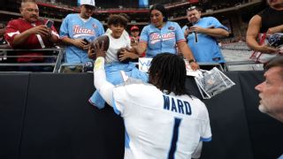GLENDALE, Ariz. -- It took five tries, but Tennessee Titans rookie quarterback Cam Ward finally got his first NFL win behind an improbable fourth-quarter comeback Sunday at Arizona. The Titans, who trailed 21-6 in the fourth, saw their win probability fall to as low as 1.8%. But, led by Ward's 193 passing yards in the final quarter, the Titans scored 16 unanswered points to stun the Cardinals 22-21, marking the second-most-improbable comeback this season, according to NFL Next Gen Stats. The victory snapped a 10-game losing streak by Tennessee dating back to last season. Ward completed 13 of 18 passes in the final frame for 193 yards -- more than the 155 fourth-quarter passing yards he had in the previous four games combined. "I think the second half, I really saw the field better in terms of just getting the ball out, letting my guys make plays," said Ward, who threw for a career-high 265 yards. "I wish I would've started better personally, but at the end of the day it don't matter how you start. It's how you finish." After completing only 5 of his 16 passes in the first half, Ward bounced back and made some throws in the second. On the Titans' first drive of the fourth quarter, he found Calvin Ridley on a seam route for a 47-yard gain, then dropped a pass perfectly over the shoulder to Gunnar Helm for a 19-yard gain to the Cardinals' 1-yard line. On the next play, Tony Pollard punched it in to make the score 21-12. "Cam made big plays when we needed him to," Titans coach Brian Callahan said. "The play selection and Cam's execution of it were spot-on. That's what you need in those moments." The win wouldn't have happened without some good fortune. A pass intended for Ridley was tipped by linebacker Mack Wilson Sr. and intercepted by safety Dadrion Taylor-Demerson. Taylor-Demerson fumbled as he tried to run after the interception, and Titans receiver Tyler Lockett recovered the ball in the end zone for a touchdown to pull the Titans within two points.  The Tennessee defense forced a punt on Arizona's next offensive series. Ward and the Titans' offense took over at their own 18-yard line, down by two points with 1:53 remaining. Ward completed 3 of his 4 throwing attempts, including a well-placed pass to Ridley for a 38-yard gain that set up Joey Slye's 29-yard winning field goal. "Cam did a hell of a job of controlling that offense and getting us down to be able to kick that field goal," Titans defensive lineman Jeffery Simmons said. "I told him that's why we drafted you No. 1 overall. His calmness in that pocket. I don't know how many rookie quarterbacks could have that type of poise."