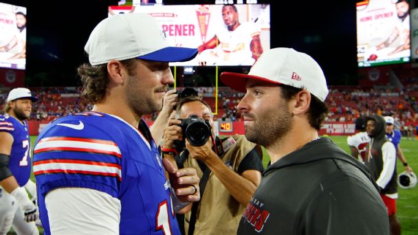 Mayfield was selected first in the 2018 NFL draft by the Cleveland Browns, and Allen was the seventh pick by the Bills. Mayfield won the first meeting between the quarterbacks in 2019 (Browns 19, Bills 16), then Allen won the second in 2023 (Bills 24, Buccaneers 18). Plenty is on the line when they meet again in Orchard Park as the Bills look to stay within reach of the New England Patriots (1.5 games back), and the Buccaneers try to maintain their 1.5-game lead in the NFC South.