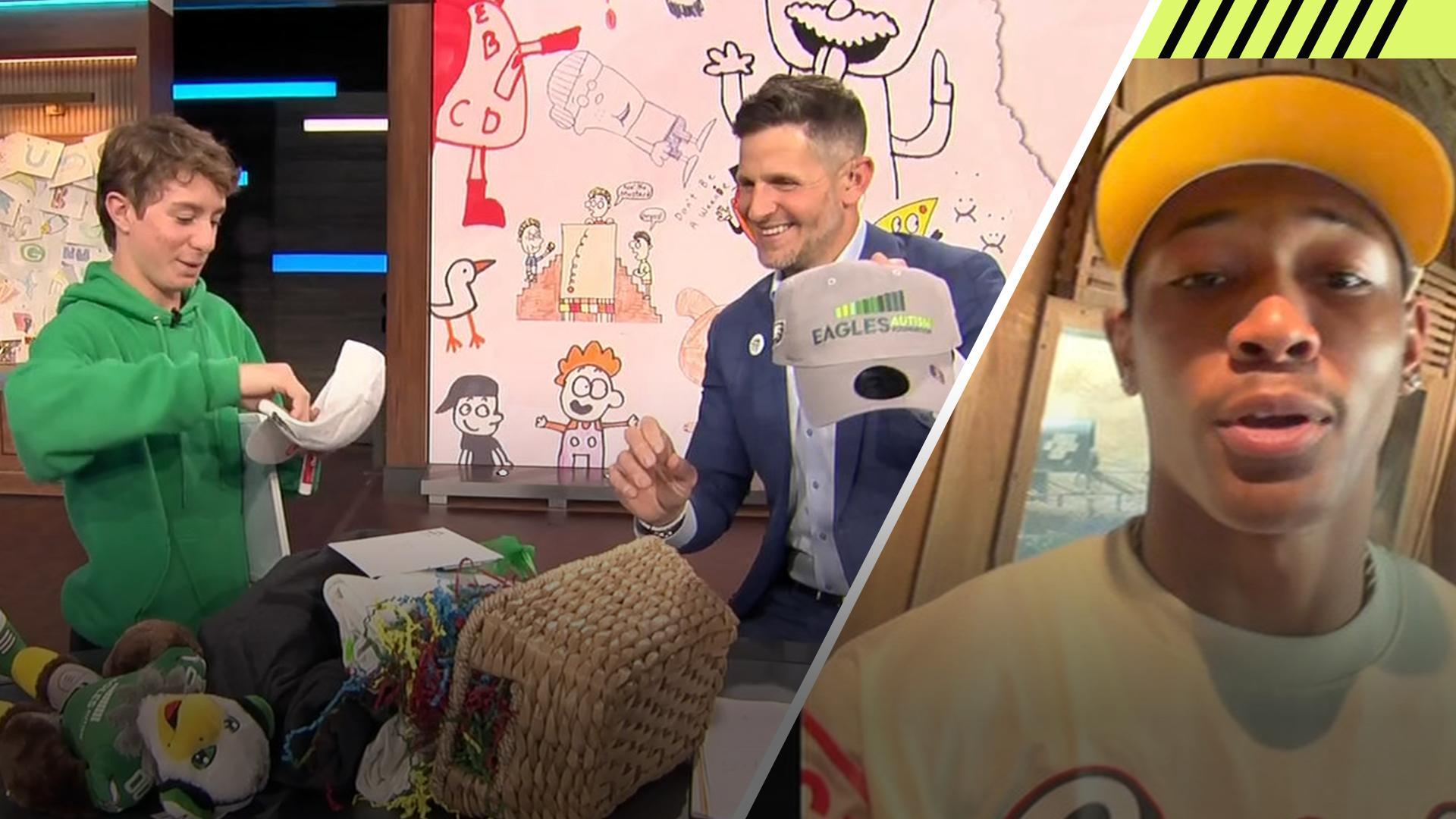 Madden Orlovsky receives a "swag bag" from the Eagles' DeVonta Smith as "NFL Live" recognizes World Autism Awareness Day.