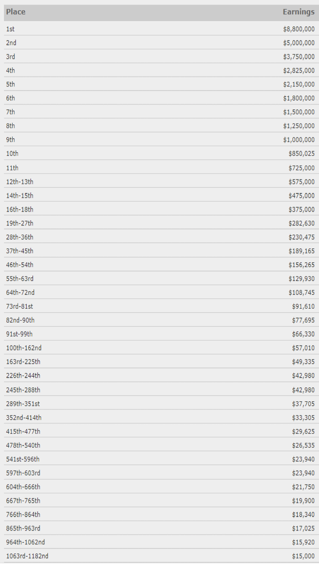 The staggering numbers for the 2018 World Series of Poker main event are in. With 7,874 players -- second-most behind the peak online poker-driven turnout in 2006 -- and 4,571 for the final day, the 2018 WSOP main event generated a total prize pool of just over $74 million. The winner will receive $8.8 million, everyone at the final table is guaranteed at least $1 million and 1,181 total players will cash, for a minimum of $15,000. Here's what the full payout table looks like: