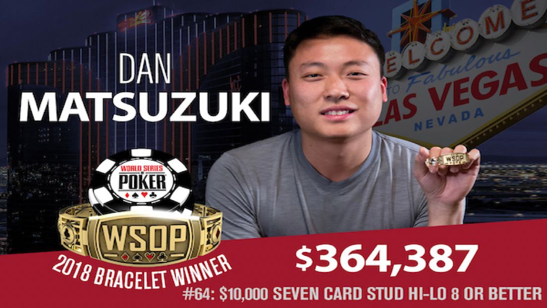 All but one of the pre-WSOP main event bracelet events are now in the books. Three tournaments lingered, waiting for a winner, heading into Tuesday, and two gold bracelet winners were crowned. Dan Matsuzuki outlasted a 141-player field to win the $10,000 Seven Card Stud Hi-Lo 8 or better championship -- denying Scott Bohlman the chance to be the first two-time 2018 WSOP winner heads up. Tim Andrew won the $365 pot-limit Omaha Giant event, which had starting sessions throughout the summer, and took down a $116,015 prize for outlasting a field of 3,250 entries. Finally the $888 Crazy Eights event got down to three players -- Galen Hall, Niels Herregodts and Eduards Kudrjavcevs -- who will return on Thursday once all three get a chance to play Day 1C of the main event. There will also be 12 more bracelet events, starting on Thursday, culminating in the returnof the $1 million Big One for One Drop.