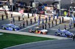 CONCORD, NORTH CAROLINA - MAY 28: Drivers and crew stand for the national anthem prior to the NASCAR Cup Series Alsco Uniforms 500 at Charlotte Motor Speedway on May 28, 2020 in Concord, North Carolina. (Photo by Jared C. Tilton/Getty Images)