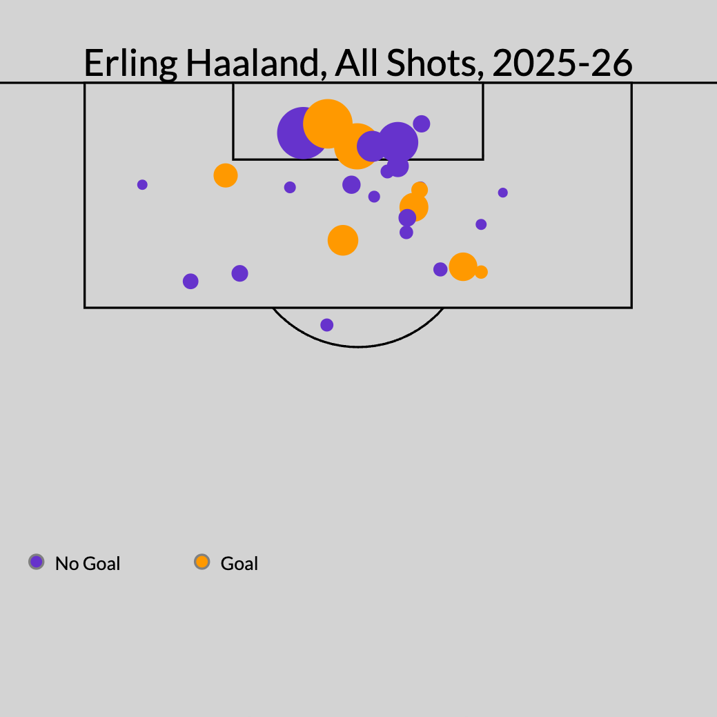 Normally, you can only get to goal-scoring numbers like this with some really hot finishing, but that's not even happening. No -- though six games, Haaland has become the closest thing we've seen to a perfect goal-scorer. Take a look at this shot map: the bigger the circle, the higher the expected goals, or xG, value: