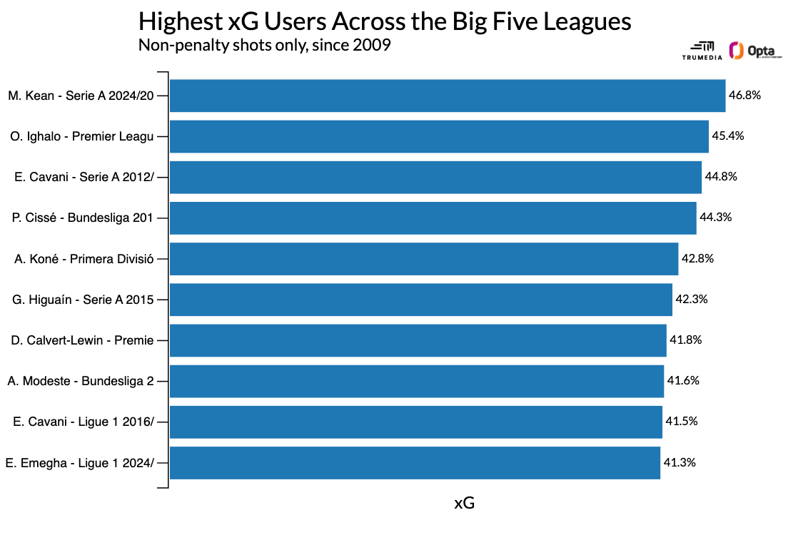 But again, that's just shots. Once we account for the quality of those shots, Haaland's current rate stands alone. The next-highest share actually happened last season: Moise Kean's 46.8% of the xG for Fiorentina. And here's the top 10 for full-season xG hoarders across the Big Five leagues since 2009: