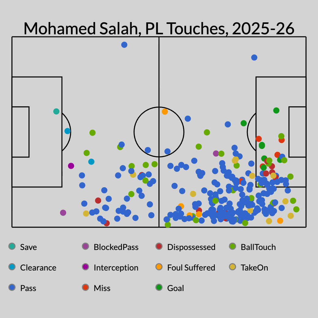 In addition to all the goals and assists, Salah has been as good as anyone at both moving the ball into the penalty area and getting on the ball inside of the penalty area. Last season, he led the Premier League in passes into the penalty area with 93, and he nearly lapped the Premier League in touches inside the penalty area. Salah recorded 356; next-most was Antoine Semenyo's 191.