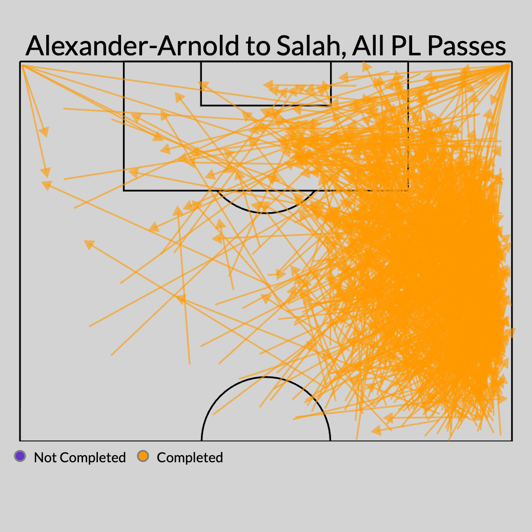 Alexander-Arnold became a starter in 2017-18, the season Salah arrived from Roma. Over that time, he completed 1,161 forward passes to Salah -- 400 more than any other combination on Liverpool and, by my best guess, more than any other combination in the Premier League. If we look at all passes in the attacking third, in any direction, then Salah's 805 to Alexander-Arnold makes the most prolific combo -- 200-plus more than the second-most prolific duo: Alexander-Arnold to Salah.