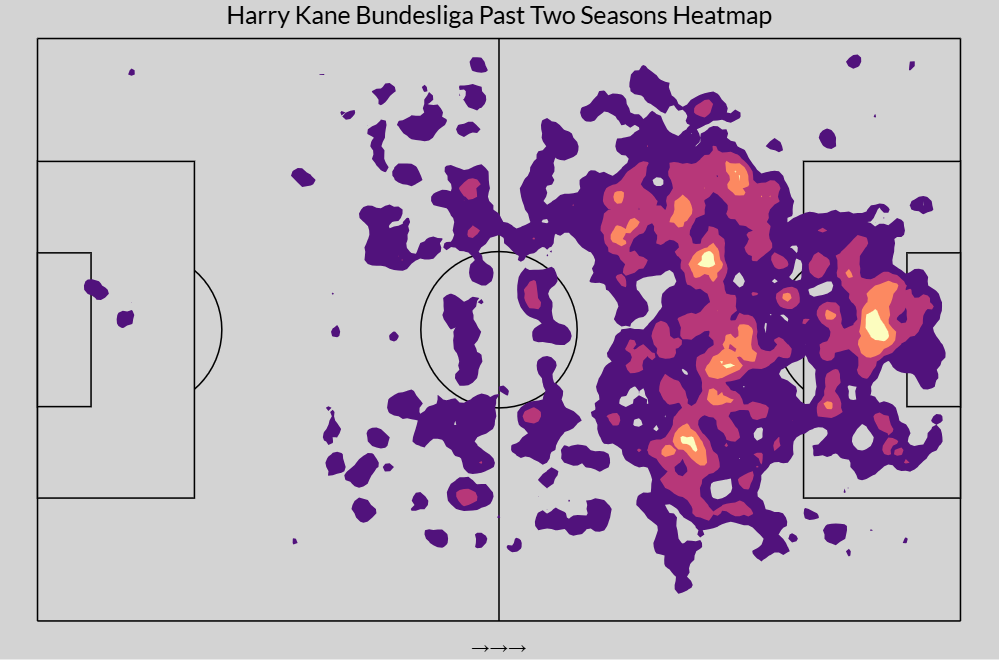 Kane's heat map from his last two seasons at Tottenham, depicting where he was most active, helps show how his game has changed. More color appears in his own half, near the center circle, or in half-spaces (the channels between center backs and fullbacks) away from goal.