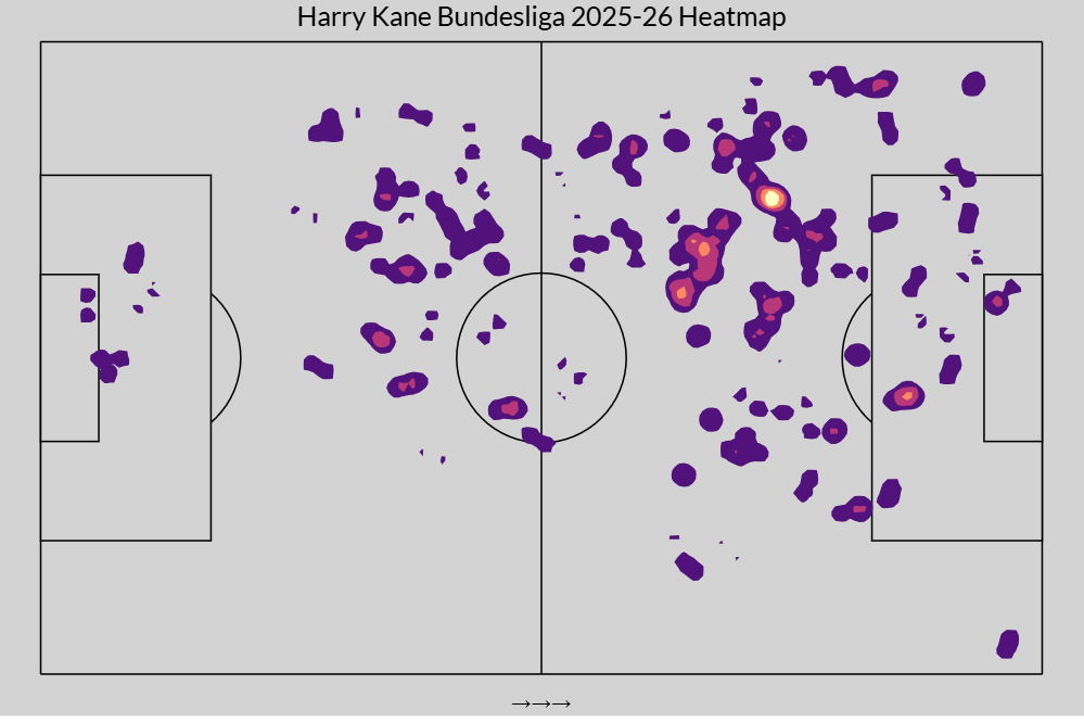 Looking at Kane's heat map for the 2025-26 season, spots emerge all over the pitch, with highlighted areas deep in his own half.
