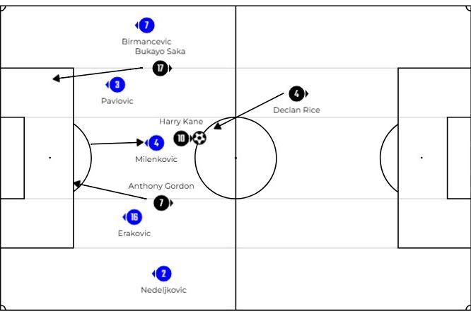 In the ninth minute of the same game, Kane received the ball near the sideline in the left-back position, wriggled past two challengers and found Gnabry in space.