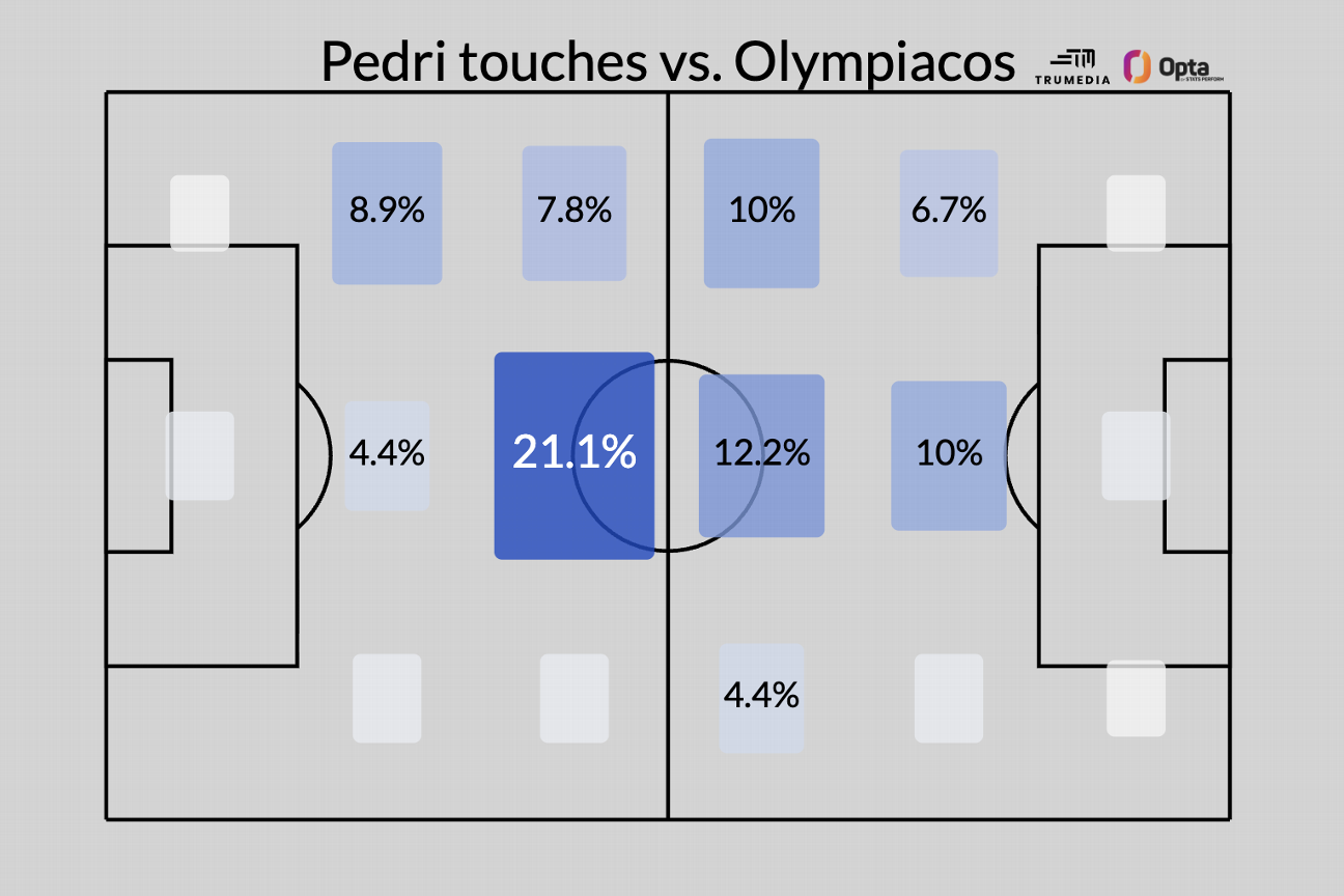 Pure pivot-man perfection. Pedri recorded 27 combined progressive carries (12) and progressive passes (15), and he had a team-leading six ball recoveries. This touch map tells you everything you need to know about his role against Olympiacos (and how well he played it).