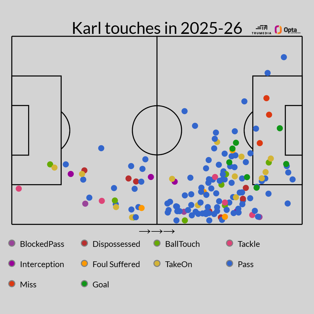 Arguably, Karl's most distinctive feature is his ball progression at pace. He manages physical contact well for his size, handles the ball neatly in tight areas and accelerates quickly away from pressure. His rapid changes of direction often open up space that he can exploit with disguised passes, give-and-go combinations, or early crosses. All of which are skills that make him hard to defend against.
