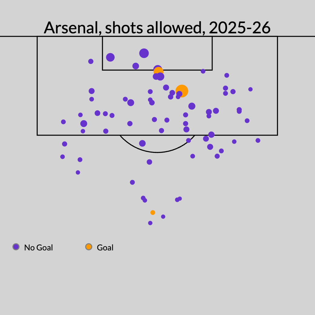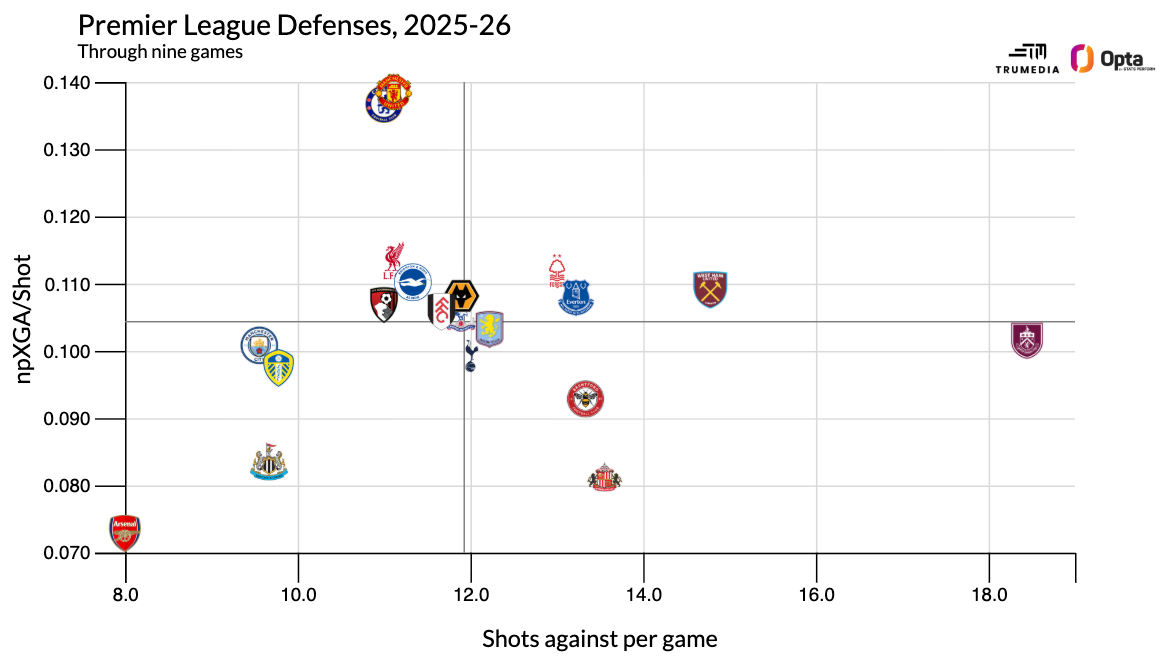 Incredibly, though, Arsenal are currently leading the Premier League in shots allowed and xG, or expected goals, allowed per shot. They're such an outlier that they're almost literally lying on the outside of this chart: