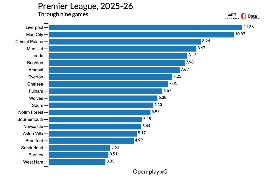 They've been running cold in front of goal when they're not in set-piece situations, but they're still only seventh in open-play xG through nine matches: