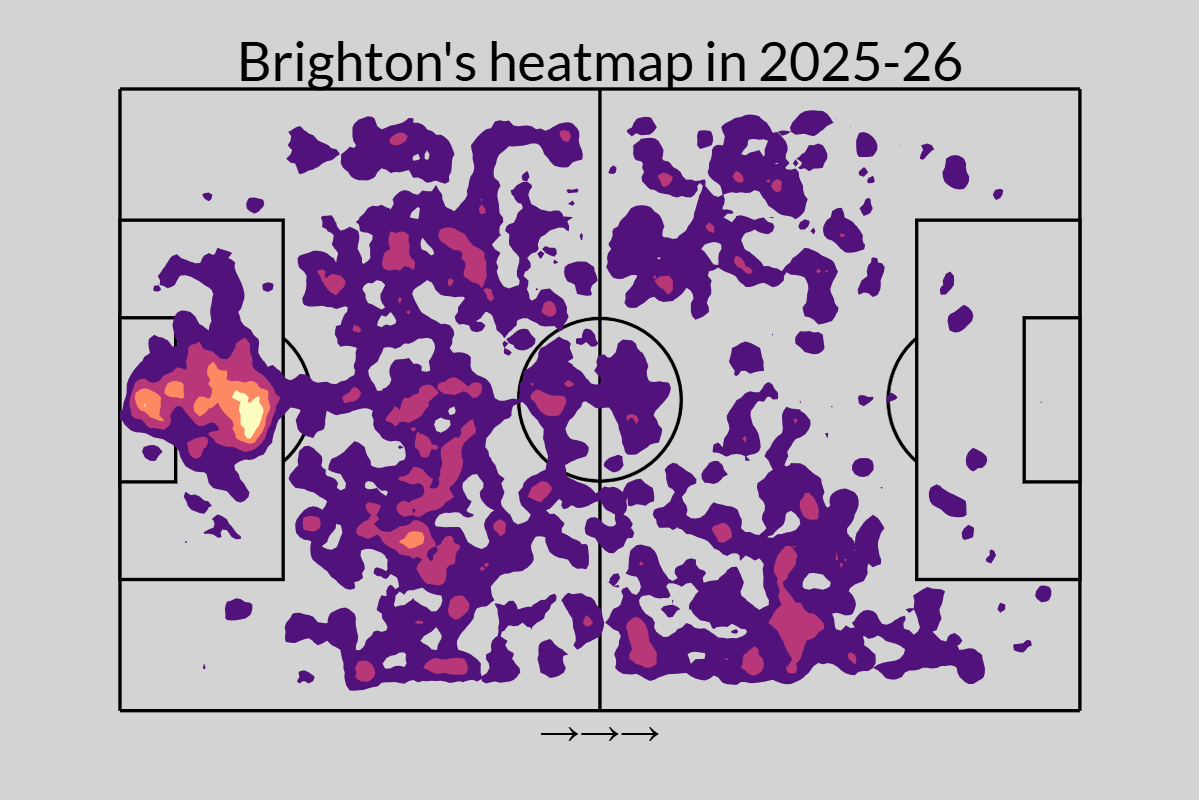 Brighton's attacking output thus far has been underwhelming, with only six goals scored in six games. While the team have shown composure and control in possession, much of this play has been confined to their own half (as shown by their heatmap). This indicates a strong focus on defensive structure and discipline, but it has come at the cost of creativity and attacking threat.