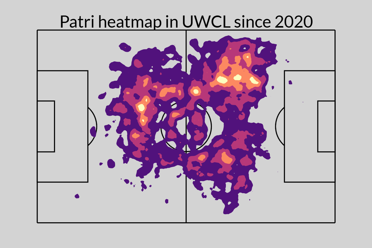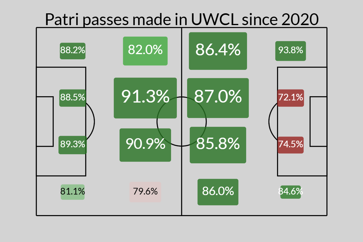 Beyond her tactical traits, she also is an immovable object in duels. Patri has a large radius of control, allowing her to claw back possession even in precarious situations, and she often bullies her opponent off the ball.
