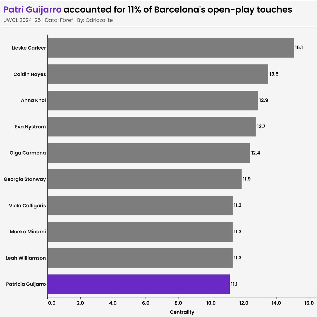 As shown by the graphic above, Patri ranked 10th for "centrality" across the UWCL last season. She accounted for 11.1% of Barcelona's total open-play touches, and has averaged over 100 open-play touches per 90 minutes across the last two UWCL seasons. In fact, her and Bayern Munich's Georgia Stanway are the only central midfielders in a list full of center backs and full backs -- positions which are typically the target of the first pass out in the buildup.