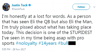 After starting 210 consecutive regular-season games for the New York Giants, Eli Manning is being shown the bench. The No. 1 overall pick in the 2004 draft, Manning has played his entire career with the Giants, leading New York to two Super Bowl championships (and garnering two Super Bowl MVP honors along the way). Needless to say, the football community -- in particular, Manning's former teammates -- didn't stay quiet on the surprising news that Geno Smith will assume starting quarterback duties in place of Manning.  Even actress Kate Mara, a niece of Giants owner John Mara, weighed in: So what's next for the youngest Manning? With only five weeks left in the season, it's possible No. 10 has played his last game in a Giants uniform. If so, perhaps other teams could be interested. -- Meaghan Latella