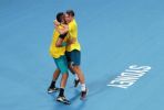 SYDNEY, AUSTRALIA - JANUARY 09: Nick Krygios of Australia celebrates with team mate John Millman after winning match point in their quarter final doubles match against Jamie Murray and Joe Salisbury of Great Britain during day seven of the 2020 ATP Cup at Ken Rosewall Arena on January 09, 2020 in Sydney, Australia. (Photo by Matt King/Getty Images)