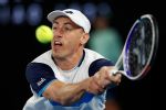MELBOURNE, AUSTRALIA - JANUARY 24: John Millman of Australia plays a backhand during his Men's Singles third round match against Roger Federer of Switzerland on day five of the 2020 Australian Open at Melbourne Park on January 24, 2020 in Melbourne, Australia. (Photo by Darrian Traynor/Getty Images)