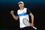 MELBOURNE, AUSTRALIA - JANUARY 24: John Millman of Australia celebrates after winning a point during his Men's Singles third round match against Roger Federer of Switzerland on day five of the 2020 Australian Open at Melbourne Park on January 24, 2020 in Melbourne, Australia. (Photo by Cameron Spencer/Getty Images)