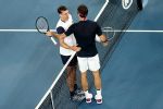 MELBOURNE, AUSTRALIA - JANUARY 24: Roger Federer of Switzerland hugs John Millman of Australia after winning his Men's Singles third round on day five of the 2020 Australian Open at Melbourne Park on January 24, 2020 in Melbourne, Australia. (Photo by Hannah Peters/Getty Images)