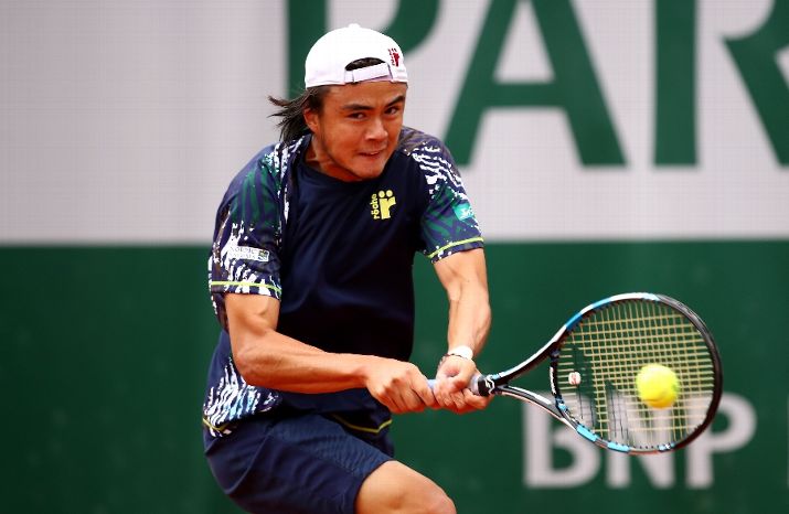 PARIS, FRANCE - MAY 23: Taro Daniel of Japan hits a backhand during the Men's Singles first round match against Martin Klizan of Slovakia on day two of the 2016 French Open at Roland Garros on May 23, 2016 in Paris, France. (Photo by Clive Brunskill/Getty Images)