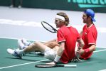 MADRID, SPAIN - NOVEMBER 22: Andrey Rublev of Russia and team mate Karen Khachanov celebrate winning match point in their quarter final doubles match against Serbia on Day Five of the 2019 Davis Cup at La Caja Magica on November 22, 2019 in Madrid, Spain. (Photo by Alex Pantling/Getty Images)