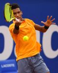 BARCELONA, SPAIN - APRIL 25: Felix Auger-Aliassime of Canada plays a forehand hand against Kei Nishikori of Japan during the round of 16 match on day two of the Barcelona Open Banc Sabadell at Real Club De Tenis Barcelona on April 25, 2019 in Barcelona, Spain. (Photo by David Ramos/Getty Images)