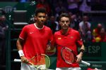 MADRID, SPAIN - NOVEMBER 24: Felix Auger-Aliassime of Canada (L) and Roberto Bautista Agut of Spain (R) pose for a photo ahead of their singles final match during Day Seven of the 2019 Davis Cup at La Caja Magica on November 24, 2019 in Madrid, Spain. (Photo by Clive Brunskill/Getty Images)