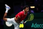 MADRID, SPAIN - NOVEMBER 24: Felix Auger-Aliassime of Canada plays a serve in his singles final match against Roberto Bautista Agut of Spain during Day Seven of the 2019 Davis Cup at La Caja Magica on November 24, 2019 in Madrid, Spain. (Photo by Clive Brunskill/Getty Images)