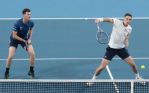 SYDNEY, AUSTRALIA - JANUARY 05: Joe Salisbury of Great Britain plays a backhand alongside Jamie Murray of Great Britain during their Group C doubles match against Sander Gille and Jordan Vliegen of Belgium during day three of the 2020 ATP Cup Group Stage at Ken Rosewall Arena on January 05, 2020 in Sydney, Australia. (Photo by Mark Metcalfe/Getty Images)