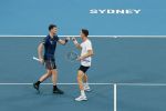 SYDNEY, AUSTRALIA - JANUARY 07: Jamie Murray and Joe Salisbury of Great Britain celebrate winning a point in their Group C doubles match against Radu Albot and Alexander Cozbinov of Moldova during day five of the 2020 Sydney International at Ken Rosewall Arena on January 07, 2020 in Sydney, Australia. (Photo by Matt King/Getty Images)