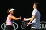 MELBOURNE, AUSTRALIA - JANUARY 24: Desirae Krawczyk of the United States and Joe Salisbury of Great Britain play in their Mixed Doubles first round match against Su-Wei Hsieh of Taiwan and Neal Skupski of Great Britain on day five of the 2020 Australian Open at Melbourne Park on January 24, 2020 in Melbourne, Australia. (Photo by Mike Owen/Getty Images)