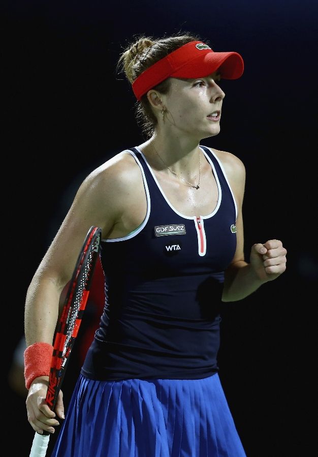 DUBAI, UNITED ARAB EMIRATES - FEBRUARY 15: Alize Cornet of France celebrate a point in her match against Kirsten Flipkens of Belguim during day one of the WTA Dubai Duty Free Tennis Championship at the Dubai Duty Free Stadium on February 15, 2015 in Dubai, United Arab Emirates. (Photo by Francois Nel/Getty Images)