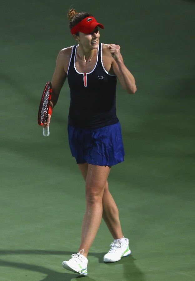 DUBAI, UNITED ARAB EMIRATES - FEBRUARY 15: Alize Cornet of France celebrates defeating Kirsten Flipken of Belguim during day one of the WTA Dubai Duty Free Tennis Championship at the Dubai Duty Free Stadium on February 15, 2015 in Dubai, United Arab Emirates. (Photo by Francois Nel/Getty Images)