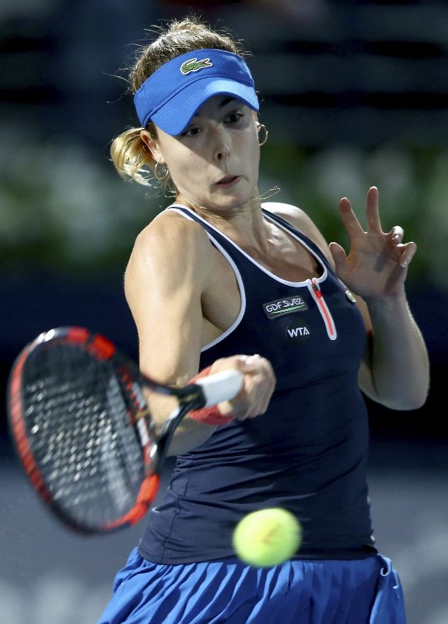 DUBAI, UNITED ARAB EMIRATES - FEBRUARY 18: Alize Cornet of France in action in her match against Caroline Wozniacki of Denmark during day four of the WTA Dubai Duty Free Tennis Championship at the Dubai Duty Free Stadium on February 18, 2015 in Dubai, United Arab Emirates. (Photo by Francois Nel/Getty Images)