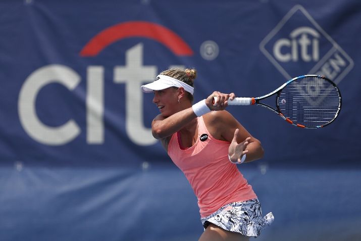 WASHINGTON, DC - JULY 22: Yanina Wickmayer of Belgium returns a shot to Kristina Mladenovic of France during day 5 of the Citi Open at Rock Creek Tennis Center on July 22, 2016 in Washington, DC. (Photo by Matt Hazlett/Getty Images)