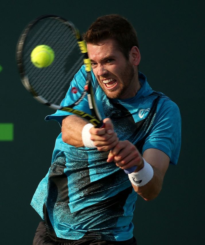 • KEY BISCAYNE, FL - MARCH 25: Austin Krajicek of the USA plays a match against Denis Istomin of Uzbekistan during Day 3 at the Miami Open at Crandon Park Tennis Center on March 25, 2015 in Key Biscayne, Florida. (Photo by Mike Ehrmann/Getty Images)