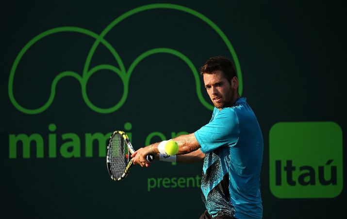 KEY BISCAYNE, FL - MARCH 25: Austin Krajicek of the USA plays a match against Denis Istomin of Uzbekistan during Day 3 at the Miami Open at Crandon Park Tennis Center on March 25, 2015 in Key Biscayne, Florida. (Photo by Mike Ehrmann/Getty Images)