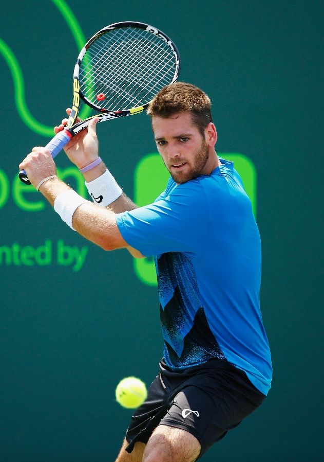 KEY BISCAYNE, FL - MARCH 27: Austin Krajicek returns the ball to Bernard Tomic of Australia during day 5 of the Miami Open at Crandon Park Tennis Center on March 27, 2015 in Key Biscayne, Florida. (Photo by Al Bello/Getty Images)
