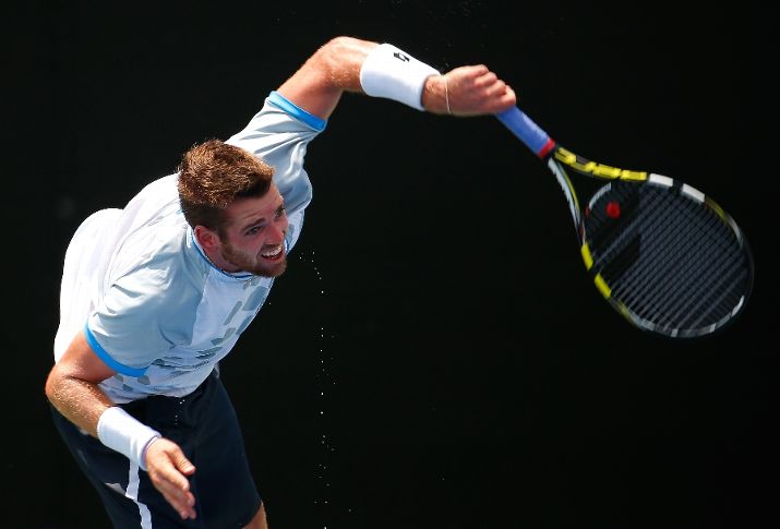 ATLANTA, GA - JULY 28: Austin Krajicek serves to Marcos Baghdatis of Cyprus during the BB&T Atlanta Open at Atlantic Station on July 28, 2015 in Atlanta, Georgia. (Photo by Kevin C. Cox/Getty Images)